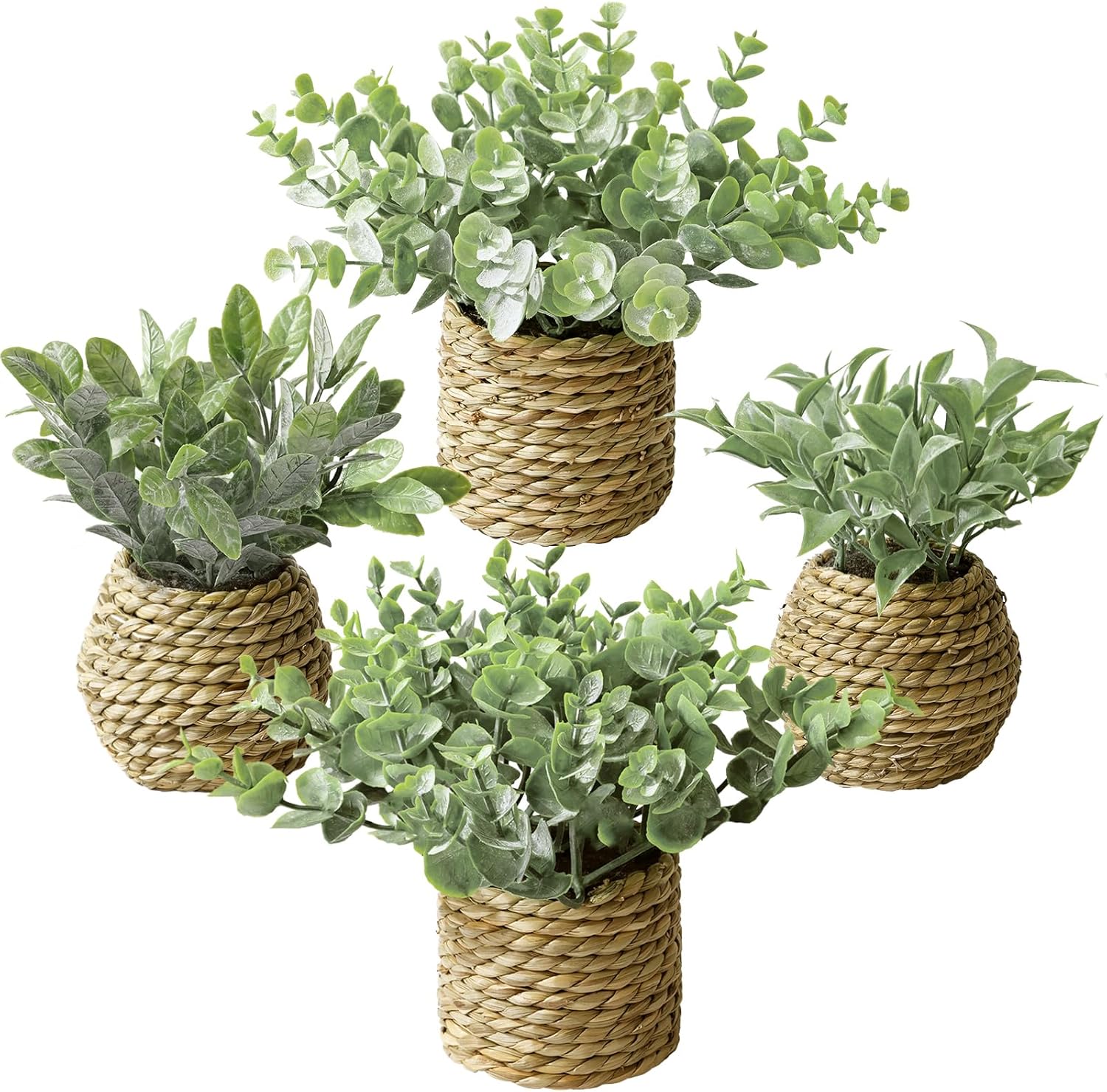 Small Fake Plants: 7 Inches Artificial Plants with Seagrass Handwoven Planters, Indoor Farmhouse Decorations, Eucalyptus Plant for Home Bathroom Office Shelf Tabletop Desk Room Decor or Gift
